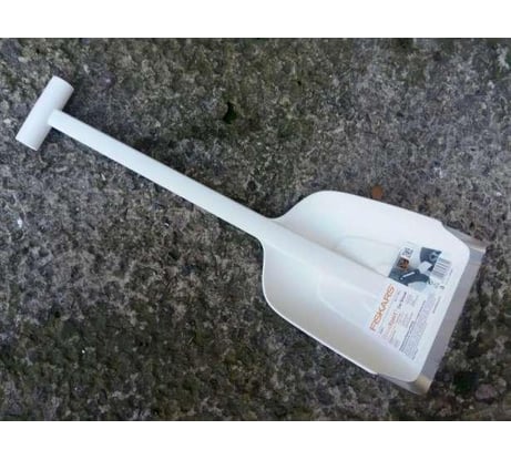 Пришла совсем без упаковки, в итоге естественно на белой лопате все заляпанное серое, черное, лежала на складах, в машине доставки, внешний вид в итоге испортили … Для обычной китайской лопатки нормально, для Fiskars конечно так себе… Узкий ковш для снега, лучше выбирать на 10-15 см шире.