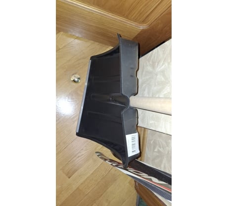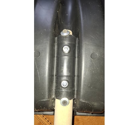 1. Из-за мягкости пластика и ширины 510мм - нестабильная геометрия, не очень удобно таскать колотый лед и комья мерзлого снега. 2. Для увеличения надежности крепления лопаты к черенку: а) Подложил резинку, чтобы черенок не болтался в отверстии лопаты б) Просверлил отверстие под 3ий саморез и, соответственно, крепил к черенку на 3 самореза