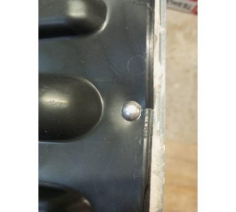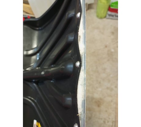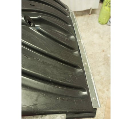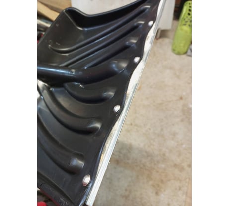 Неправильно подшита стальной полоской. Клепки слишком редкие, в прогалы набивается снег/лед, который потом рвёт пластик. Лопата к трубе прикручена на саморез, нужно менять на клëпку