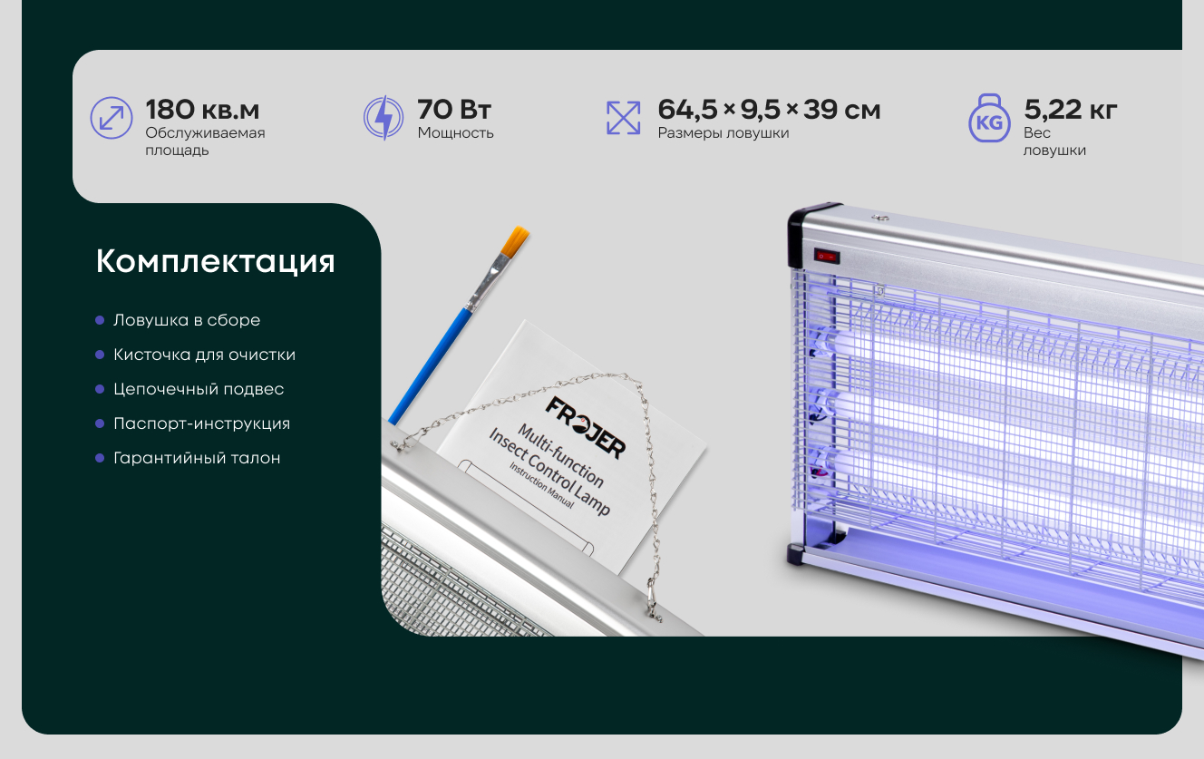 Ловушка для насекомых электрическая Frojer PRO D60IN-SP- это эффективное и безопасное устройство номинальной мощностью 70 Вт, которое обеспечивает защиту от комаров, мошек, мух, ос, моли и других летающих насекомых на площади до 180 кв. м.