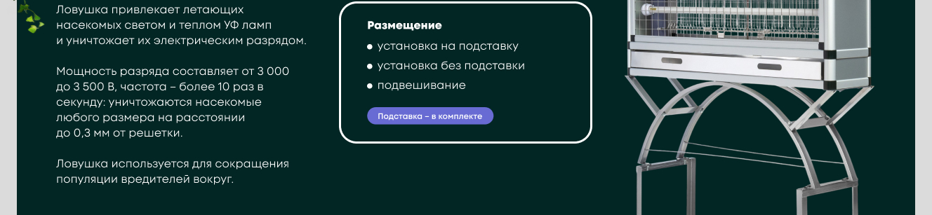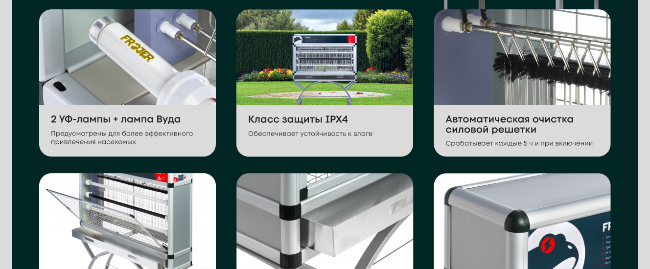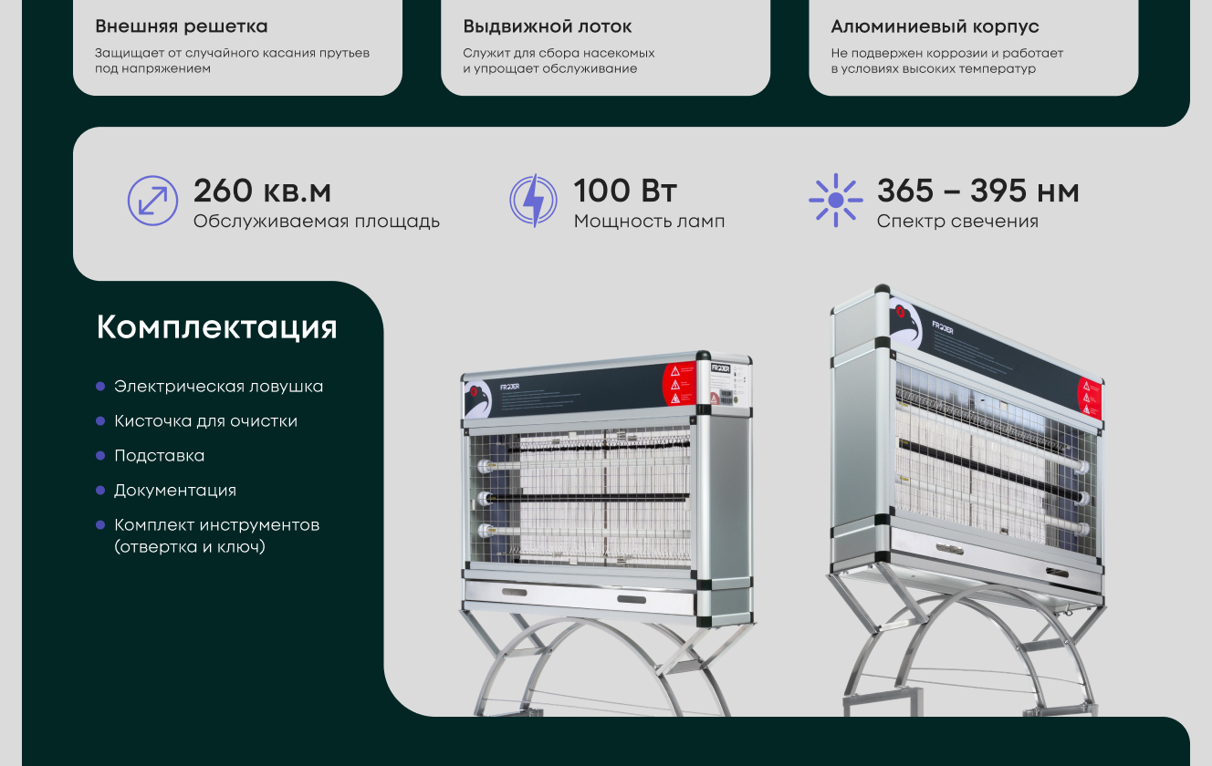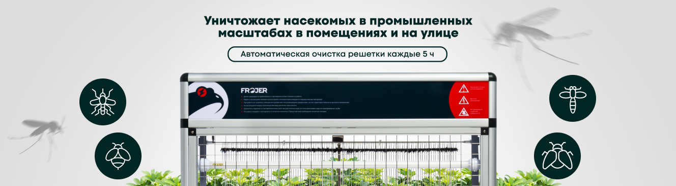 Профессиональная сетевая электрическая ловушка для насекомых FROJER PRO XC60-FL3 – это высокопроизводительное устройство, предназначенное для уничтожения летающих насекомых в помещениях и на улице, не имеющее аналогов на российском рынке. Ловушка обеспечивает эффективное уничтожение комаров, мошек, мух, ос, моли и других летающих насекомых на площади до 260 кв. м. Данная модель рекомендована для использования в следующих сферах: