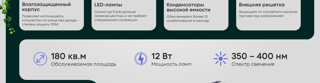 Ловушка для насекомых электрическая Frojer PRO DX60WP - это эффективное и безопасное устройство номинальной мощностью 12 Вт, которое обеспечивает защиту от комаров, мошек, мух, ос, моли и других летающих насекомых на площади до 180 кв. м. (здесь имеется в виду площадь охвата и привлечения насекомых к прибору). Предназначена для использования на верандах, в беседках и в других закрытых жилых, торговых или производственных помещениях. Ее эффективность достигает максимума в темное время суток или сумерки, когда посторонний свет не заглушает фонарь и насекомые наиболее активны. Однако, противомоскитный эффект при свете слабее, чем в темноте, так как лампа становится менее заметной для насекомых и не выглядит для них очевидной целью. Антимоскитная лампа Frojer PRO DX60WP привлекает насекомых ультрафиолетовым свечением в привлекательном для них диапазоне 365-395 нм, формируемым встроенной светодиодной лампой LED, расположенной в центре корпуса. Подлетающие на свет к сетке на расстояние ближе 0,3 мм вредители поражаются тихим электрическим разрядом, который возникает между прутьями, расположенными вокруг источника света. Благодаря этому, электроловушка работает бесшумно и не издает неприятных звуков, что делает его более комфортным для пользователя. Привлеченные УФ светом насекомые погибают при контакте с сеткой, а вертикальное расположение прутков делает ее самоочищающейся - комары, моль, осы, мухи просто падают вниз в съемный лоток.