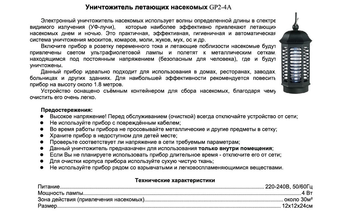 Электронная ловушка-уничтожитель против комаров, москитов, мошкары,мотыльков и прочих летающих насекомых. Высокоэффективная УФ-лампа «магнитом» притягивает насекомых к ловушке. Уничтожение происходит за счет электрического разряда при соприкосновении насекомых с металлической решеткой. Вертикальная конструкция решетки сделана таким образом, что элементы работают независимо друг друга, что позволяет прибору отлично функционировать даже тогда, когда решетка частично повреждена. Уничтожитель не имеет запаха и не содержит химических веществ, аэрозолей и ядов. Не загрязняет воздух и абсолютно безопасен для людей и домашних животных. Изготовлен из высококачественного огнеупорного пластика, имеет стильный дизайн, крючок для подвешивания (например, к потолку) и съемный контейнер для удобной чистки после использования. Устройство предназначено для работы внутри помещений: в домах и в офисах, на фабриках и в больницах, в кафе, столовых и других местах. Материал: ABS-пластик, металл. Питание: от сети 220-240В, 50-60 Гц. Источник света: УФ-лампа мощностью 4 Вт. Средняя продолжительность работы лампы: 5000-8500 часов. Зона действия (привлечения насекомых): около 30 м². Размеры: 120X120X240 мм. Модель просто чистится, благодаря съемному контейнеру.
