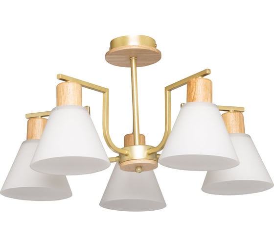 Актуальный цвет перламутрового золота придает люстре элегантность и стиль. Особый шарм создают белые стеклянные плафоны, направленные вниз. Натуральности и теплоты в интерьер добавляют декоративные элементы из натурального дерева. Благодаря интересному дизайну и компактности этот светильник станет прекрасным дополнением к любому интерьеру. Компактный размер люстры прекрасно подходит в интерьеры со стандартным потолком. Заменяемые источники света удобны в эксплуатации.