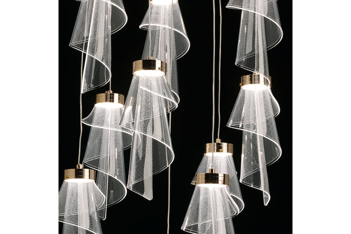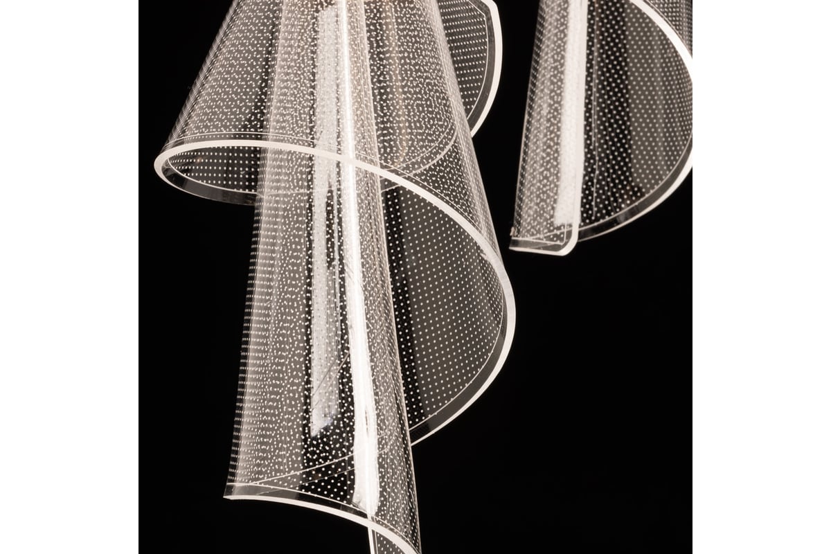 Благородный цвет золота гармонично сочетается с современным дизайном подвесной люстры. Эффектные плафоны из прозрачного акрила придают светильнику мягкости и создают уютную атмосферу.
