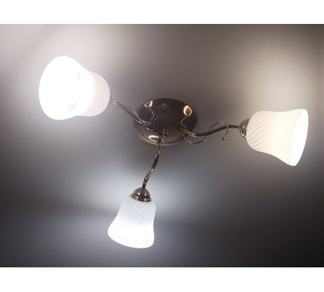 Три рожка. Лёгкая, хотя и большая. Днём смотрится вполне "прилично". Бесцветные стеклянные плафоны. Легко монтируется.