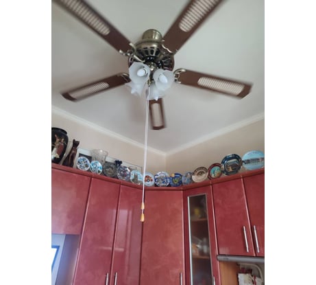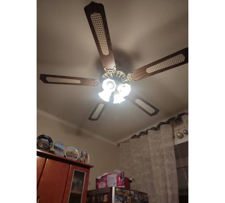 Люстра отличная. Вентилятор работает бесшумно в трёх скоростях, даже не пришлось делать балансировку лопастей. Светит ярко. Только очень короткие цепочки для включения. Купили шнур из бусинок и удлинили.