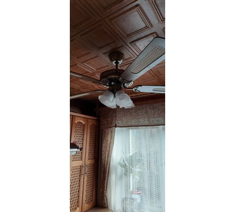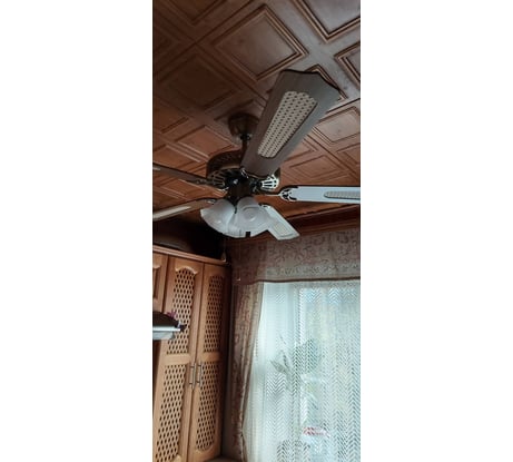 Люстра отличная. Вентилятор работает бесшумно в трёх скоростях, даже не пришлось делать балансировку лопастей. Светит ярко. Только очень короткие цепочки для включения. Купили шнур из бусинок и удлинили.