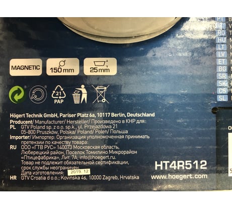 Технические характеристики магнитной чаши HOEGERT TECHNIK HT4R512