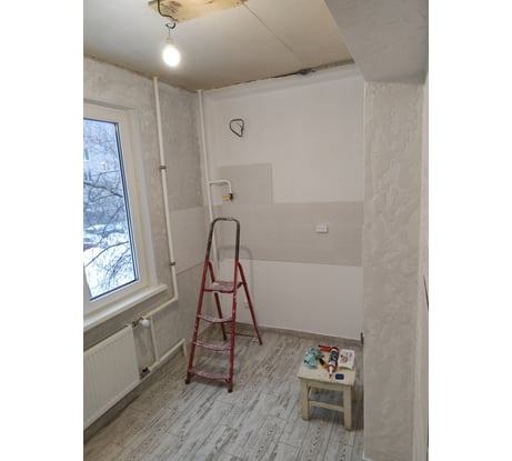 Окрашивала штукатурку из шпаклёвки белой краской. Валик оправдал все ожидания, благодаря размеру окрасил в трудных местах, около труб, окна и батареи.
