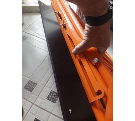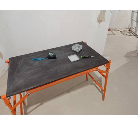 Рабочая площадка выполнена из влагостойкой ламинированной фанеры. Не разбухает и сохраняет геометрию при работе и хранении в помещениях с повышенной влажностью. При необходимости фанера легко откручивается и переставляется обратной стороной. Лицевая сторона имеет шершавую поверхность для лучшей устойчивости при работе на столике, а обратная гладкую для использования в виде верстака и для иного применения. За счет толщины 9 мм фанера представляет собой надежную и прочную столешницу, не прогибается, выдерживает вес до 150 кг.