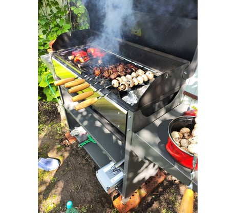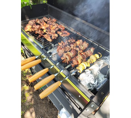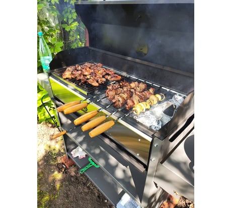 Топка длиной 85 см вмещает 15 шампуров, что позволяет одновременно приготовить 3.5 кг мяса.