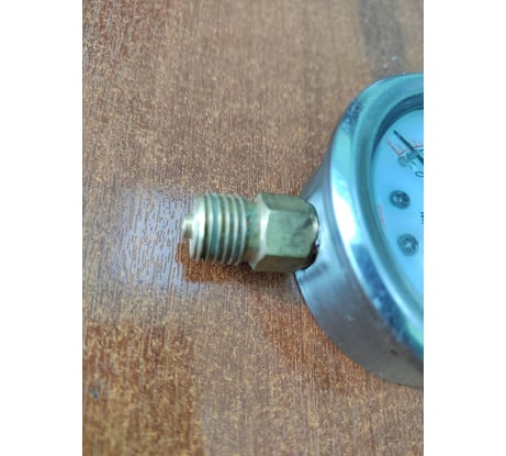 Заломы и царапины на корпусе манометра, латунная резьба имеет следы механического воздействия от произведенного ранее монтажа и остатки герметизирующего материала!