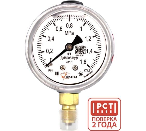 Манометр виброустойчивый ПО Физтех, АО ДМ8008-ВУф исп 1 0-1,6 МПа кт.1,5 d.63 IP54 M12x1,5 РШ, Глицерин 4687205450012