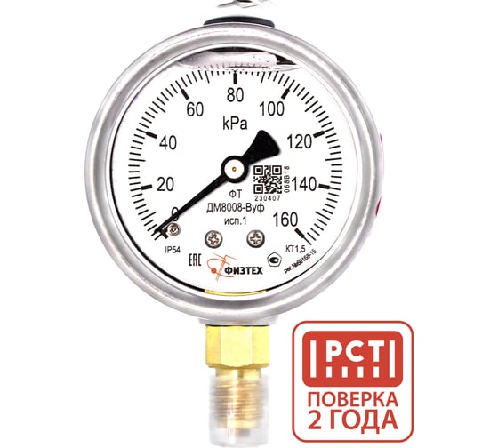 Манометр виброустойчивый ПО Физтех, АО ДМ8008-ВУф исп 1 0-160 кПа кт.1,5 d.63 IP54 M12x1,5 РШ, Глицерин 4687205450067