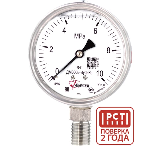 Манометр коррозионностойкий ПО Физтех, АО ДМ8008-ВУф Кс 0-10 МПа кт.1,0 d.100 IP65 M20_1,5 РШ SG, Силикон 4687205720511