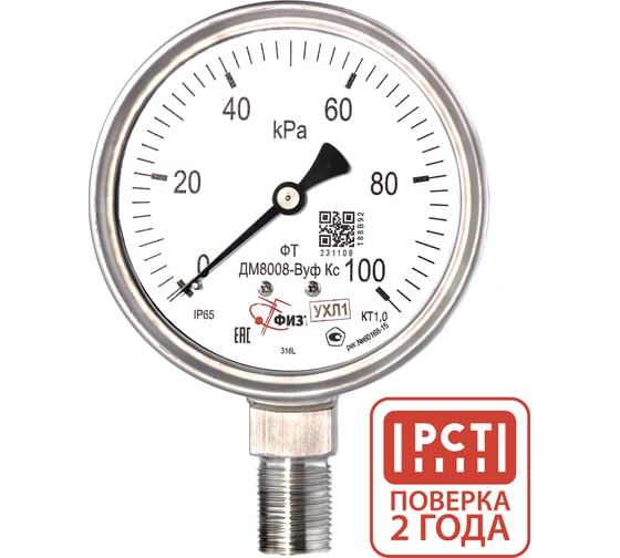 Манометр коррозионностойкий ПО Физтех, АО ДМ8008-ВУф Кс 0-100 кПа кт.1,0 d.100 IP65 M20_1,5 РШ SG Б/запол 4687205720528