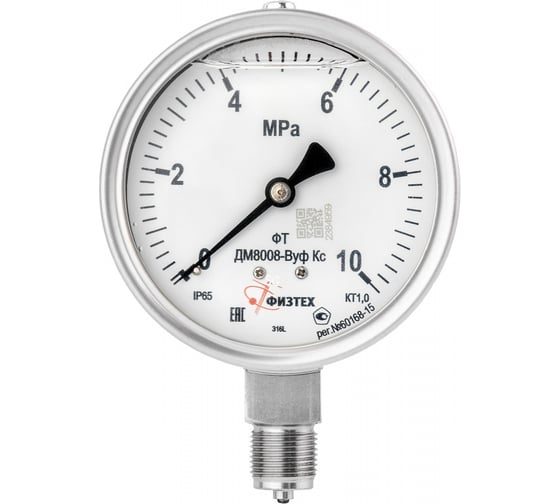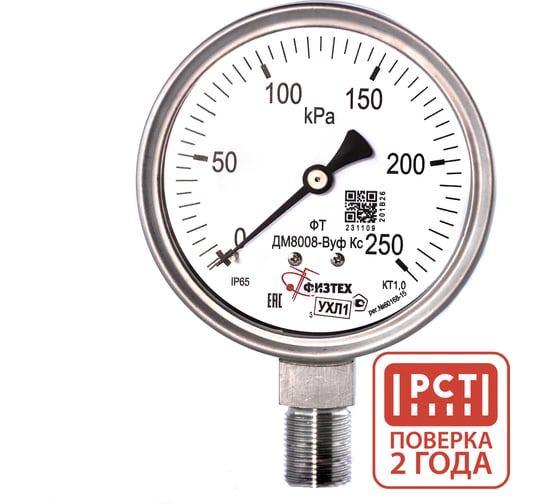 Манометр коррозионностойкий ПО Физтех, АО ДМ8008-ВУф Кс 0-250 кПа кт.1,0 d.100 IP65 M20_1,5 РШ SG Б/запол 4687205720696