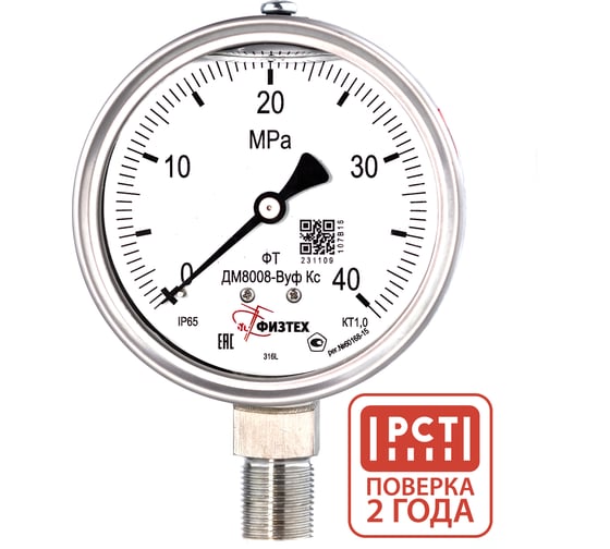 Манометр коррозионностойкий ПО Физтех, АО ДМ8008-ВУф Кс 0-40 МПа кт.1,0 d.100 IP65 M20_1,5 РШ SG, Силикон 4687205720771