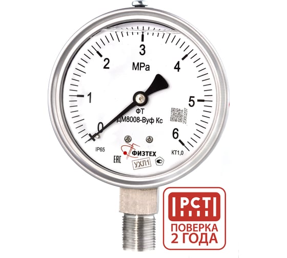Манометр коррозионностойкий ПО Физтех, АО ДМ8008-ВУф Кс 0-6 МПа кт.1,0 d.100 IP65 M20_1,5 РШ SG, Силикон 4687205720832