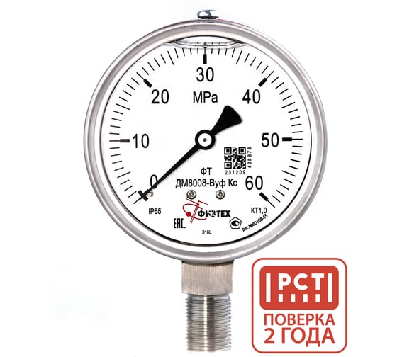 Манометр коррозионностойкий ПО Физтех, АО ДМ8008-ВУф Кс 0-60 МПа кт.1,0 d.100 IP65 M20_1,5 РШ SG, Силикон 4687205720863
