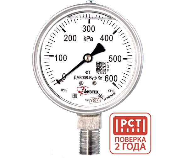 Манометр коррозионностойкий ПО Физтех, АО ДМ8008-ВУф Кс 0-600 кПа кт.1,0 d.100 IP65 M20_1,5 РШ SG, Глицерин 4687205720887