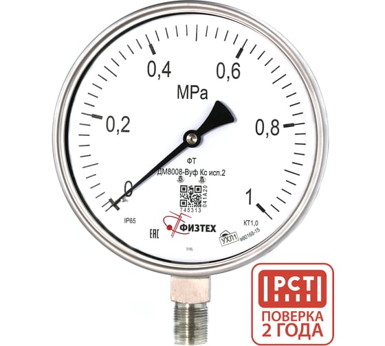 Манометр коррозионностойкий ПО Физтех, АО ДМ8008-ВУф Кс исп 2 0-1 МПа кт.1,0 d.160 IP65 M20_1,5 РШ SG, Б/запол 4687205724489