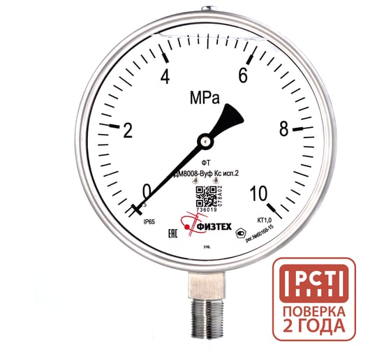Манометр коррозионностойкий ПО Физтех, АО ДМ8008-ВУф Кс исп 2 0-10 МПа кт.1,0 d.160 IP65 M20_1,5 РШ SG, Глицерин 4687205724557