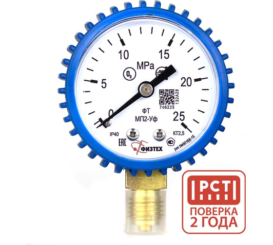 Манометр кислородный ПО Физтех, АО МП2-Уф 0-25 МПа кт.2,5 d.50 IP40 M12_1,5 РШ Кис (O2), кожух синий 4687207023061