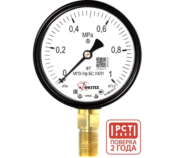 Манометр пылевлагозащищенный ПО Физтех, АО МП3-Уф 0-1 МПа кт.1,0 d.100 IP54 M20_1,5 РШ БС УХЛ1 4687205628022