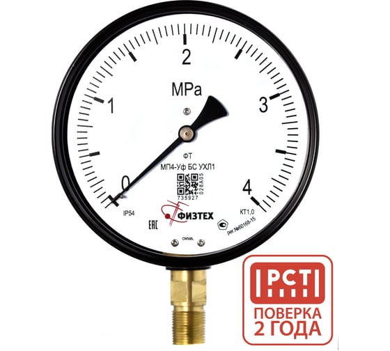 Манометр пылевлагозащищенный ПО Физтех, АО МП4-Уф 0-4 МПа кт.1,0 d.160 IP54 M20_1,5 РШ БС УХЛ1 4687205630216