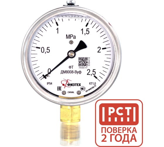 Манометр виброустойчивый Физтех ДМ8008-ВУф 0-2,5 МПа, кт1.0, d100, IP54 G,1/2 РШ, глицерин 4687205640215