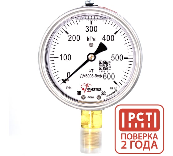 Манометр виброустойчивый Физтех ДМ8008-ВУф 0-600 кПа кт.1,0 d.100 IP54 G1/2 РШ, Силикон 4687205640451