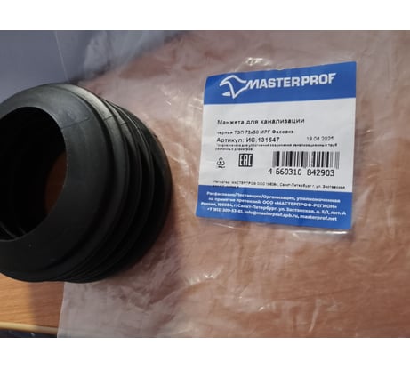 Манжета производителя “МастерПроф” (С-Пб) ИС.131647 канализационная переходная 50х73мм черная из резины ТЭП ТермоЭластоПласт. Покупали вслепую, ориентируясь только на фото и описание товара. Приятно удивила по качеству изготовления и конструктивному исполнению. Желаю производителю «МастерПроф» не снижать планку качества, а магазину «Все Инструменты» не терять связь с производителем!