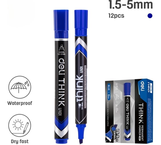 Перманентный маркер Deli Think скошенный наконечник 1.5–5 мм, синий (12 шт)