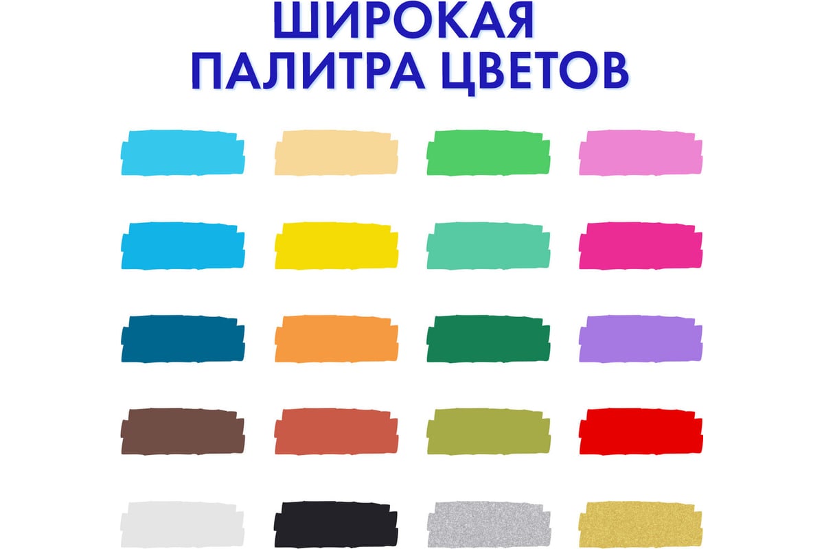 Набор акриловых маркеров с круглой формой корпуса из пластика. 20 ярких цветов. Толщина линии письма – 1 - 2 мм. Объём краски – 6 мл. Пигментированная акриловая краска на водной основе практически не имеет запаха, после высыхания обладает повышенной светостойкостью и водостойкостью. Краска обладает превосходной укрывистостью. Благодаря водной основе краска быстро сохнет и не размазывается.