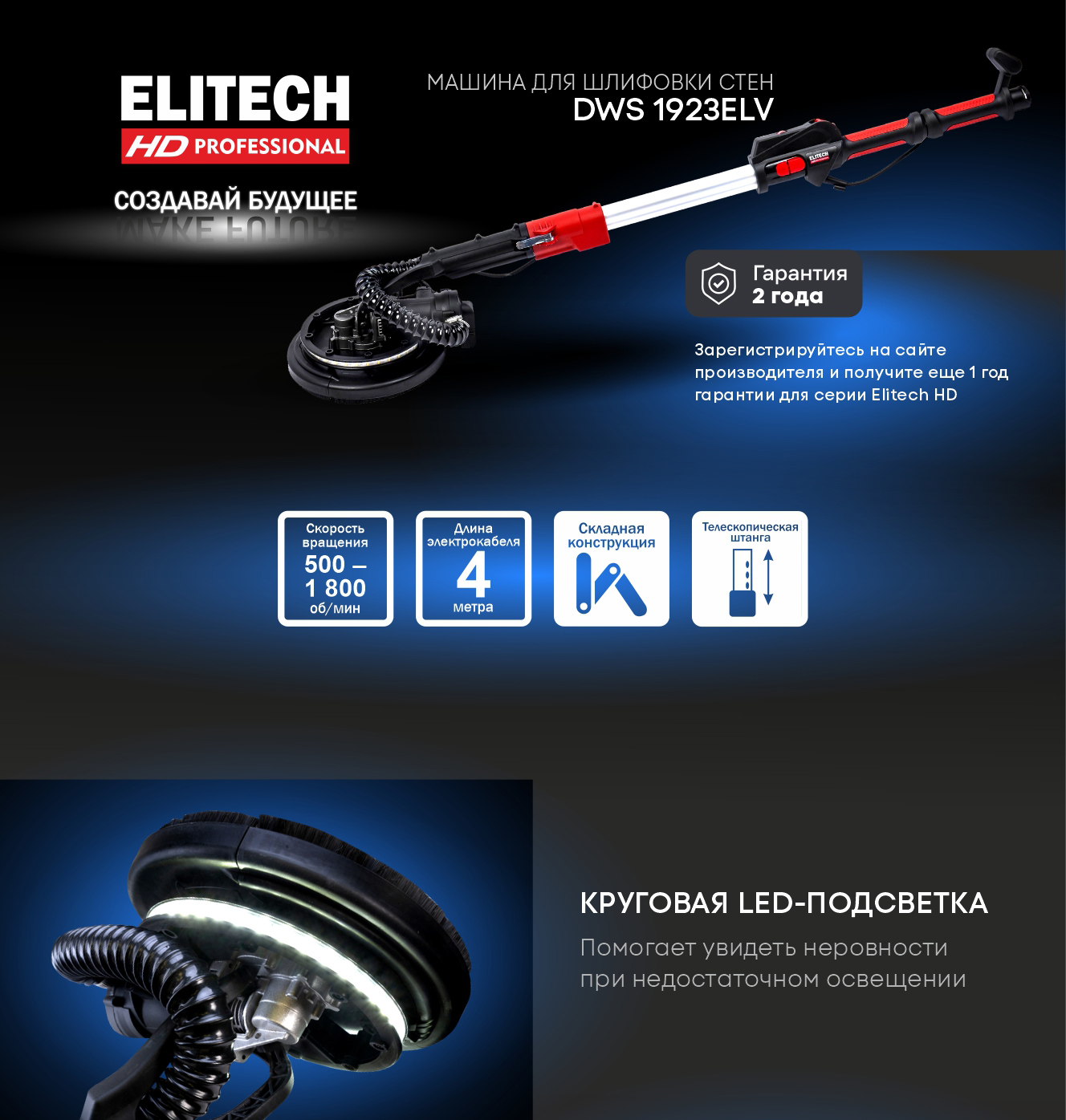 Машина для шлифовки стен ELITECH HD DWS 1923ELV мощностью 750 Вт с подошвой для установки шлифовальных кругов диаметром 225 мм и телескопической штангой предназначена для шлифовки стен и потолков, выполненных из гипсокартона или гипсовой штукатурки. Машина оснащена светодиодной лентой подсветки рабочей зоны, а также мешком для пыли и встроенным пылесосом, при возможности подключить к шлангу внешний пылесос для минимального образования пыли и достижения наилучших результатов шлифования. Вращающаяся шлифовальная подошва с сеткой или наждачным кругом обеспечивает превосходные результаты с минимальными затратами времени и усилий.
