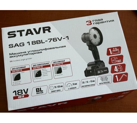 Машина углошлифовальная аккумуляторная Ставр (УШМ), 76 мм, 18V UNI-M, BL, Stavr SAG 18BL-76V-1, диск 76-105мм, посадка 10/16/20мм, 8000-12000об/мин (АКБ 2.0Ач, ЗУ,диск 4шт) 9020700111