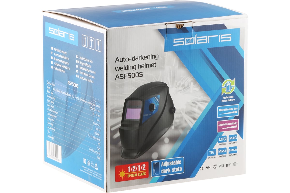 Щиток сварщика с самозатемняющимся светофильтром SOLARIS ASF500S предназначена для защиты глаз и лица от вредного воздействия сварочной дуги. Изготовлен из ударопрочного пластика. Применяется при любом виде сварки (MIG, MAG/CO2, SMAW, TIG, MMA, воздушно- углеродная резка, импульсная сварка, плазменная сварка и резка), при шлифовке.