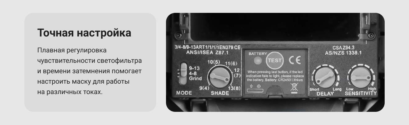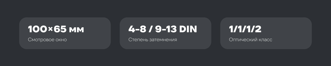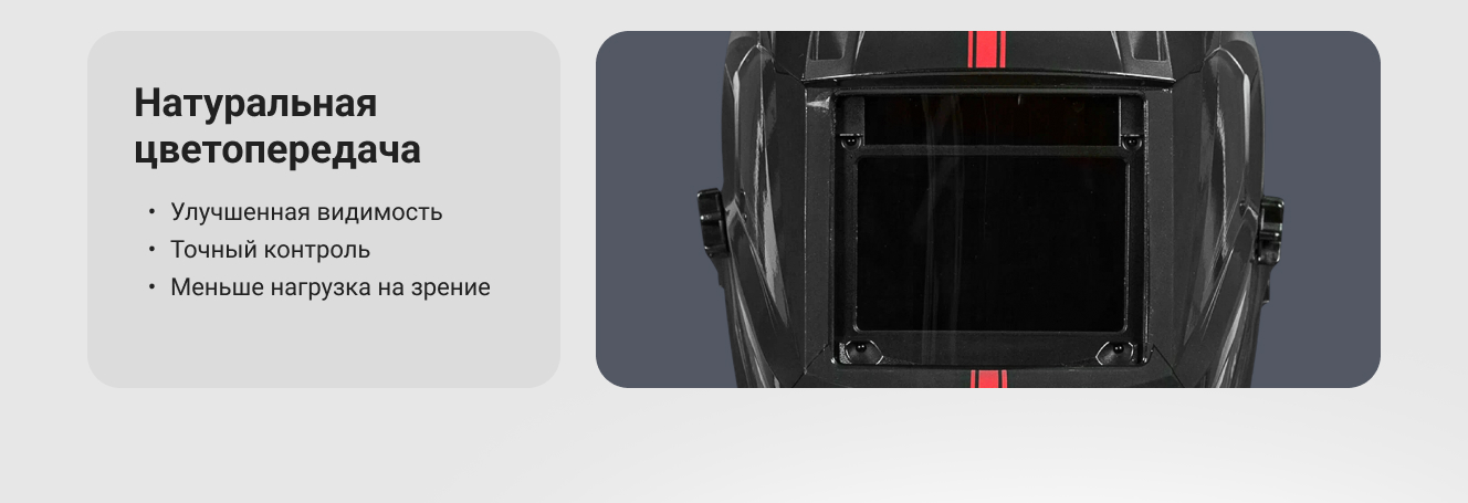 Автоматическая защита глаз. Светофильтр автоматически переключается из светлого состояния в темное при зажигании дуги.
