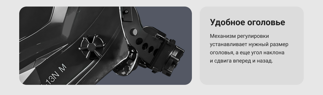 Комфорт. Система крепления при поднятии маски перемещает центр тяжести маски вниз, что снижает усталость головы и шеи сварщика.