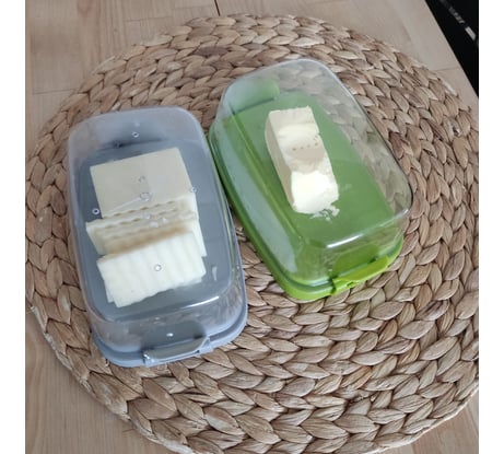Маслёнка с защелками, даже если уроните, масло не вылетит из ёмкости. Входит стандартная пачка масла. Нет бортиков, удобно отрезать. Вторую такую же, наделав дырочек в крышке, превратила в сырницу.