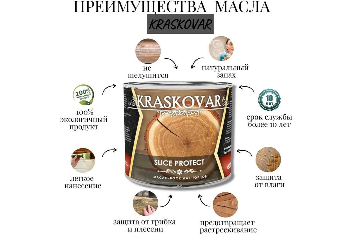 Профессиональное масло для защиты торцов Kraskovar Slice Protect создано на основе натуральных и высококачественных компонентов. Уникально подобранная рецептура позволяет эффективно защитить торцы бревен от растрескивания, замедляя неравномерный выход влаги, и глубоко проникает в структуру дерева, предотвращая образование биологических повреждений: потемнения, плесени, грибка и т.п. Продукт легко наносится, герметизируя поверхность от попадания влаги и разбухания, снижает процесс образования трещин. После нанесения создает на поверхности дерева шелковисто-матовое покрытие.
