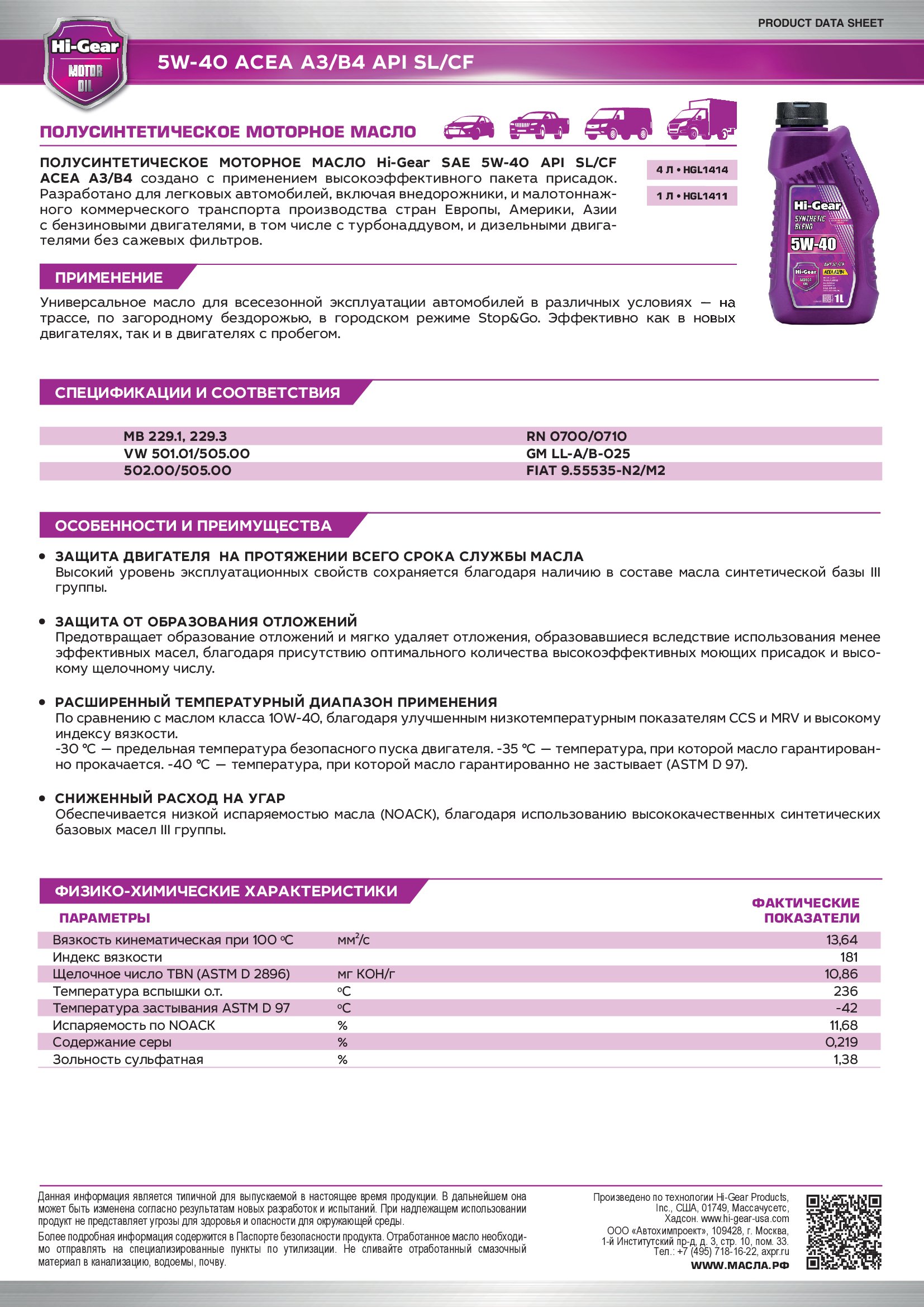 Масло моторное 5W-40 SL/CF, A3/B4, 4 л., полусинтетическое HGL1414 создано с применением высокоэффективного пакета присадок.