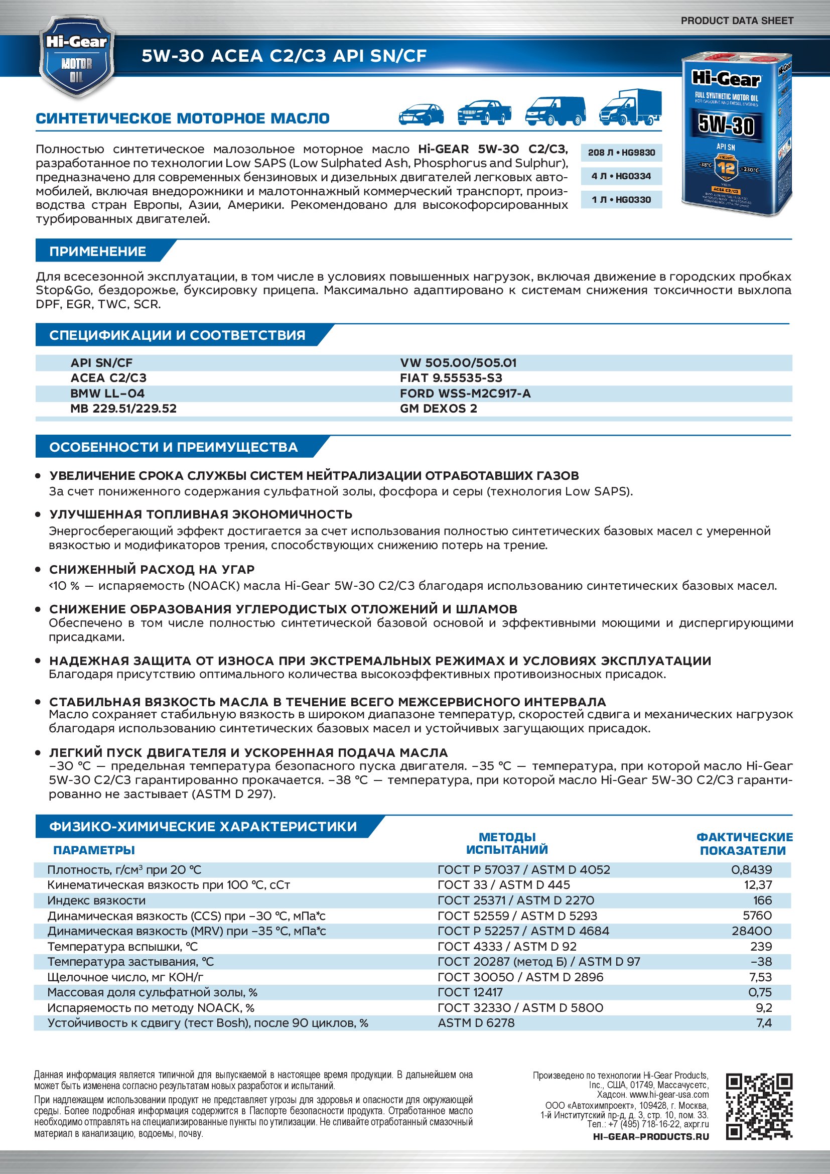 Полностью синтетическое малозольное моторное масло Hi-Gear 5W-30 C2/C3, разработанное по технологии Low SAPS (Low-Sulphated Ash, Phosphorus and Sulphur).