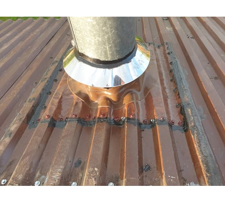 Собственной бани. Стык сэндвич-дымохода и кровли.