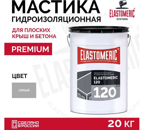 Elastomeric 120 — однокомпонентная гидроизоляционная мастика на основе блок-сополимера синтетического каучука. Применяется для устройства новых кровельных покрытий, ремонта битумных и мастичных кровель без демонтажа, а также в качестве долговечного УФ-защитного слоя для материалов, неустойчивых к солнечному излучению. Образует сплошную эластичную мембрану, устойчивую к влаге, трещинам, подвижкам основания и агрессивной среде.
