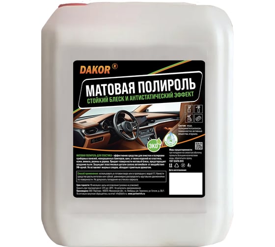 DAKOR Матовая полироль для пластика - профессиональное средство для очистки и ухода за деталями салона и экстерьера автомобиля. Полироль обновляет поверхность, придает аккуратный матовый финиш без жирного блеска, уменьшает оседание пыли благодаря антистатическому эффекту и защищает пластик от выгорания под воздействием УФ-лучей.