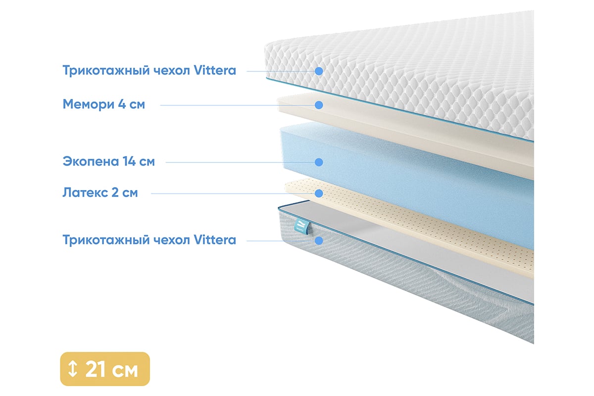 Модель Roll Standart 14 Latex Memory - анатомический чехловой матрас от бренда Promtex. У модели присутствует съемный чехол на молнии. Съемный чехол удобен в эксплуатации, его можно легко снять и надеть обратно без проблем. Для поддержания чистоты и свежести чехол можно стирать в обычной стиральной машине, он сохранит свою форму и качество после множества стирок. А главное, ткань чехла отлично дышит, она мягкая и хлопковая на ощупь. Roll Standart 14 Latex Memory является беспружинным. Основные преимущества таких моделей: полная бесшумность за счет отсутствия металлических деталей, отсутствие эффекта покачивания. Нагрузка на спальное место составляет 100 кг. Высота матраса составляет 20 см. В данной модели используются следующие материалы: Трикотаж Vittera, Memory Foam, Экопена, Латекс, Трикотаж Vittera. Экопена - это искусственный материал на основе пенополиуретана средней жесткости, который характеризуется экологичностью и гипоаллергенностью. Натуральный латекс - высокоэластичный и прочный материал, он быстро восстанавливается, не подвержен деформации, не впитывает влагу и не вызывает аллергии. Memory Foam - уникальная по своим свойствам инновационная пена с эффектом "памяти", которая полностью повторяет изгибы вашего тела. Чехол в модели изготовлен из материала Трикотаж. Модель Roll Standart 14 Latex Memory имеет 2 одинаковые стороны жесткости. Степень жесткости с обеих сторон: Средний. Гарантийный срок: 1.5 года. Срок службы составляет 10 лет.
