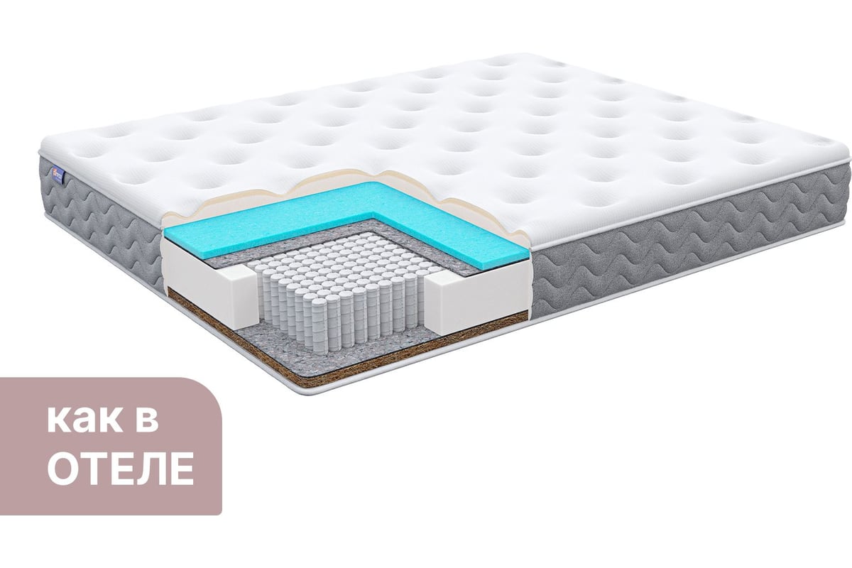 Под пышным чехлом скрываются настилочные слои наполнителей. С одной стороны установлена пена, с другой – койра кокоса. Оба материала гипоаллергенны и нейтральны для организма человека. ППУ обеспечивает более мягкую и адаптивную спальную сторону. Койра кокоса, напротив, добавляет жёсткости и плотности своей поверхности.